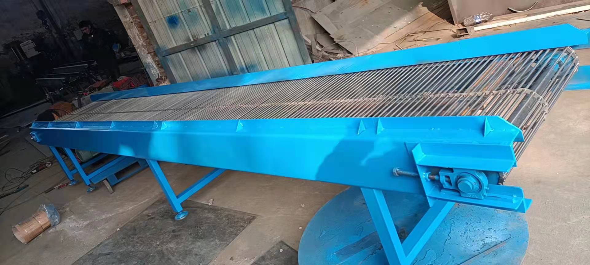 給淄博 山東超越輕工制品有限公司定做的玻璃瓶降溫傳送帶輸送機完工今天發(fā)貨 鏈桿片輸送機 長度5米 有效寬度720毫米 高度800毫米 從地面到鏈桿輸送帶上平面是800毫米 可調(diào)節(jié)的高度再700-800毫米之間 實際調(diào)節(jié)距離100毫米 節(jié)距25.4毫米 支軸直徑8毫米 在輸送帶中間加一趟鏈條片