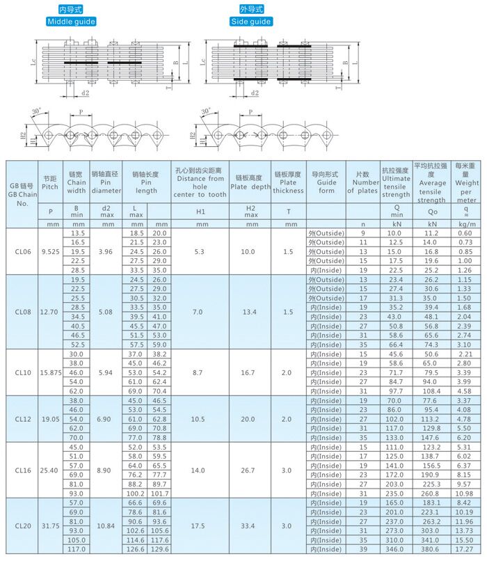 齒形鏈條的種類:CL06,CL08,CL10,CL12,CL16,CL20。