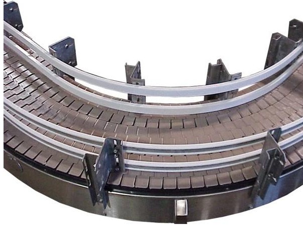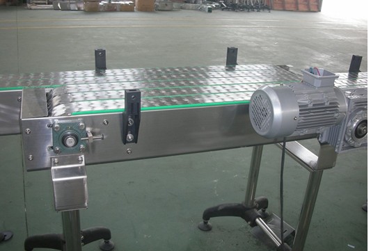 平頂鏈鏈板輸送機 能夠拐彎 升降的板式輸送帶  按客戶的要求,除了水平直輸外,還能滿足其他的要求,這種輸送機的特點就是耐磨耐腐,結構精密,輸送平穩(wěn),輸送面平穩(wěn)不倒瓶,在兩邊加側擋板,按輸送瓶子的大小,側擋板可以調(diào)節(jié)距離。