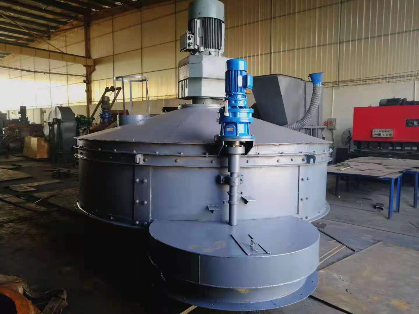 3.混料機(jī)由旋轉(zhuǎn)盤(pán)底中心的一個(gè)圓形開(kāi)孔排料,在混料機(jī)側(cè)面裝有液壓系統(tǒng)用于操控卸料門(mén)的開(kāi)合。