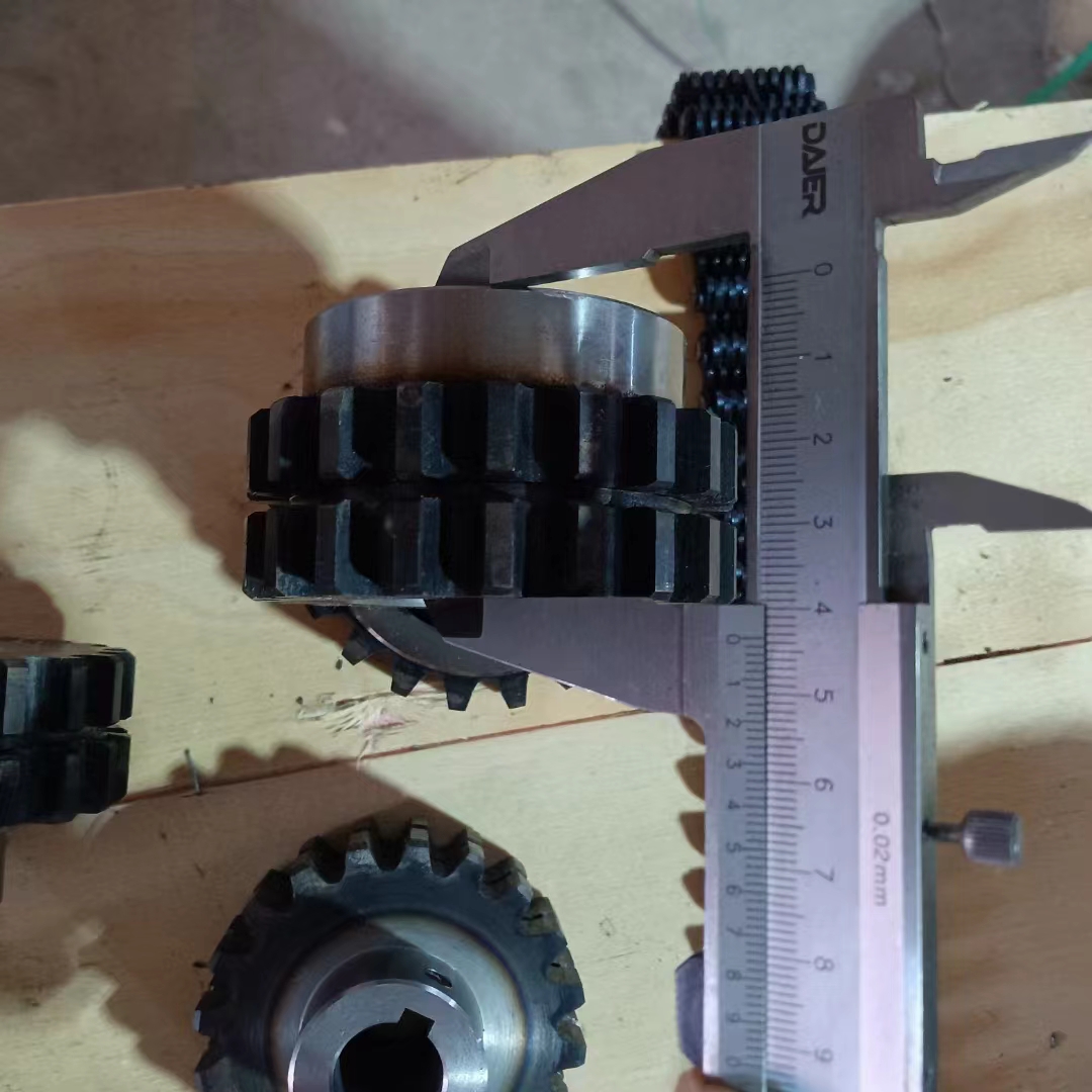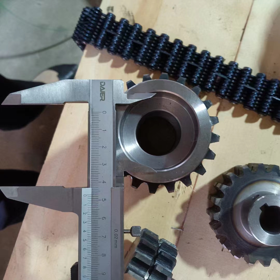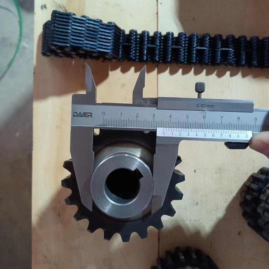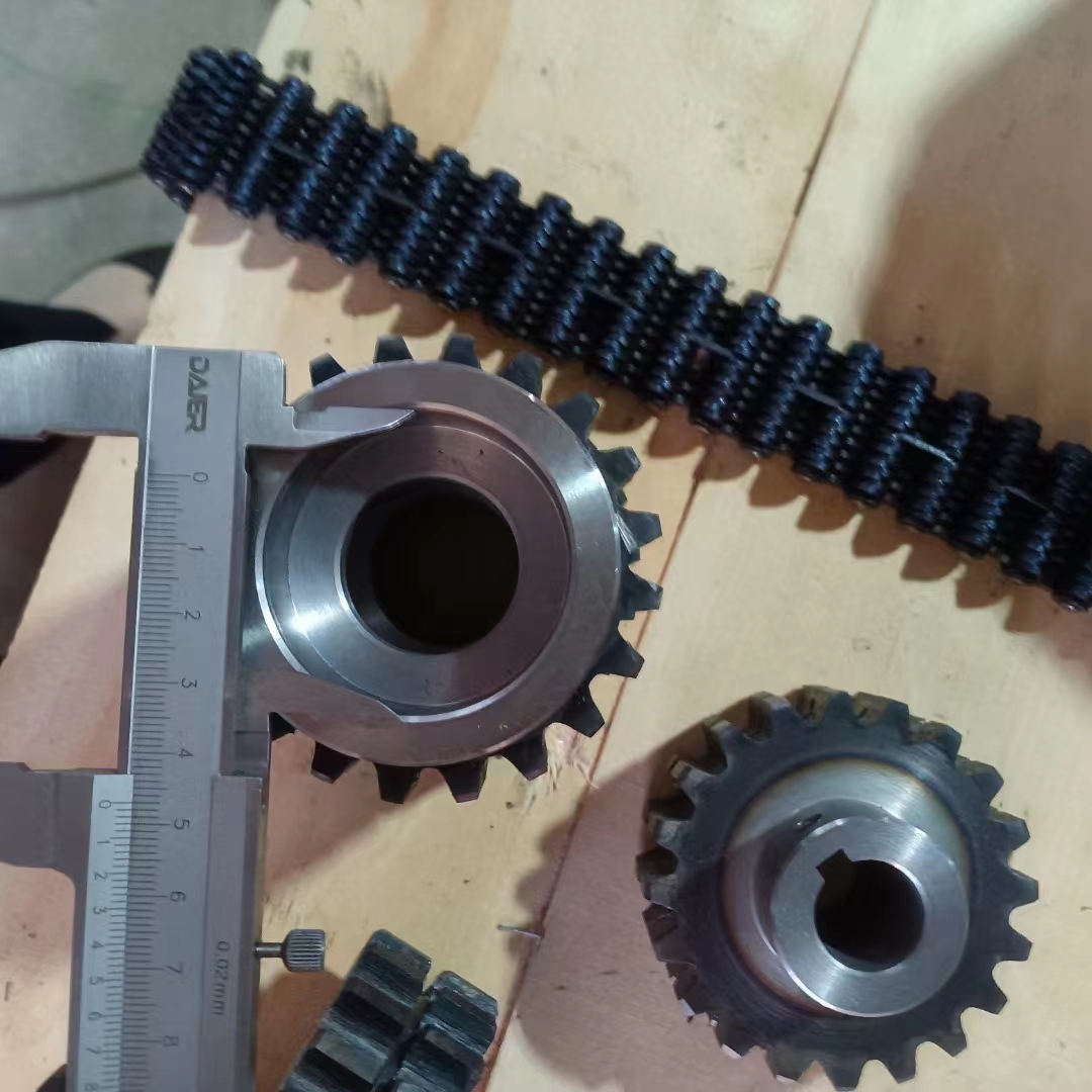 無聲鏈 齒形鏈輪 無聲鏈:也叫齒形鏈條,采用無聲齒形鏈輪帶動運轉傳動。寧津縣榮達機械制造有限責任公司定做各種無聲齒形鏈條,無聲齒形鏈輪。我們根據客戶自己的情況,客戶選型成功,我們根據客戶的數據非標定做各種齒形鏈條和無聲齒形鏈輪。齒形鏈條節(jié)距4.7625,6.35 9.525 12.7 15.875 19.05 25.4 31.75 38.1毫米的鏈條都能做,無聲齒形鏈輪根據客戶的齒數和外徑,內孔,鍵槽定做。無聲齒形鏈條的獨特優(yōu)點:高速,無噪音,高承載傳動能力,轉矩大等等優(yōu)點,逐漸取代精密滾子鏈條和同步帶。