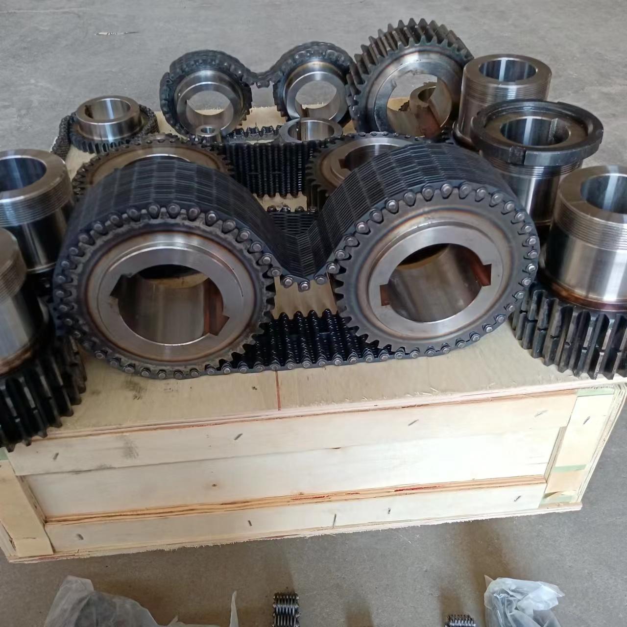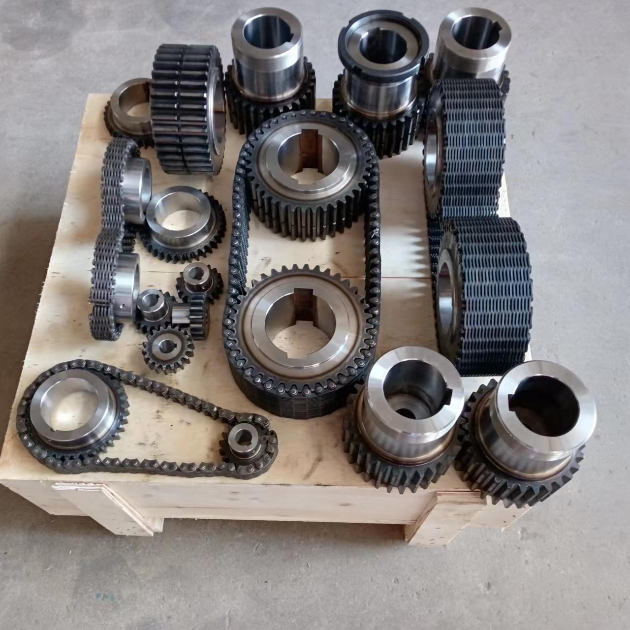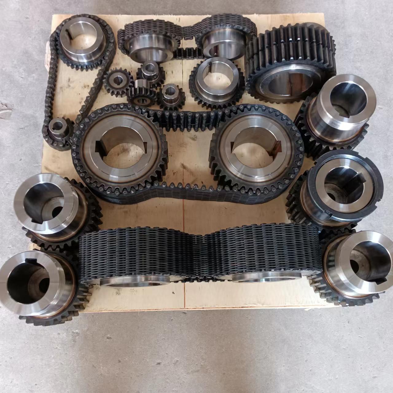 無聲鏈 齒形鏈輪 無聲鏈:也叫齒形鏈條,采用無聲齒形鏈輪帶動運轉(zhuǎn)傳動。寧津縣榮發(fā)齒輪廠定做各種無聲齒形鏈條,無聲齒形鏈輪。我們根據(jù)客戶自己的情況,客戶選型成功,我們根據(jù)客戶的數(shù)據(jù)非標定做各種齒形鏈條和無聲齒形鏈輪。齒形鏈條節(jié)距4.7625,6.35 9.525 12.7 15.875 19.05 25.4 31.75 38.1毫米的鏈條都能做,無聲齒形鏈輪根據(jù)客戶的齒數(shù)和外徑,內(nèi)孔,鍵槽定做。無聲齒形鏈條的獨特優(yōu)點:高速,無噪音,高承載傳動能力,轉(zhuǎn)矩大等等優(yōu)點,逐漸取代精密滾子鏈條和同步帶。