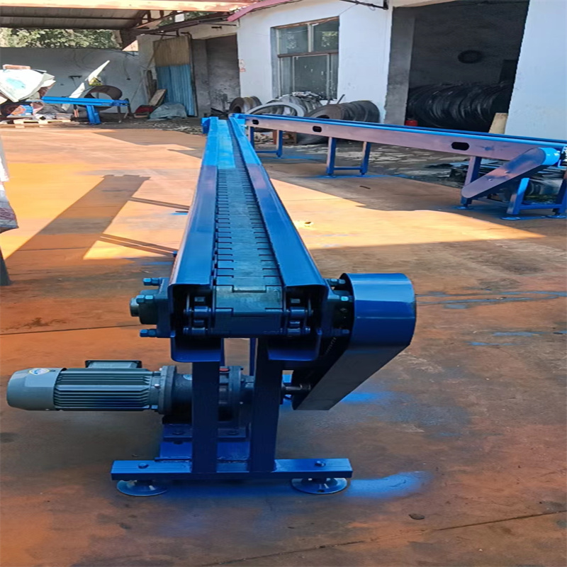 鏈板式輸送機,利用固接在牽引鏈上的一系列鏈板在水平或傾斜方向輸送物料的輸送機,以單片鋼板鉸接成環(huán)帶作為運輸機的牽引和承載構(gòu)件承載面具有橫向隔片置于槽箱中驅(qū)動環(huán)帶借隔片將煤刮運輸出。它由驅(qū)動機構(gòu)、張緊裝置、牽引鏈、板條、驅(qū)動及改向鏈輪、機架等部分組成。在冶金、煤炭、化工、電力、機械制造及國民經(jīng)濟的其他工業(yè)部門中均得到了廣泛的應(yīng)用。