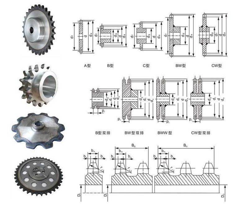 鏈輪軸面齒形兩側(cè)呈圓弧狀,以便于鏈節(jié)進(jìn)入和退出嚙合。齒形用標(biāo)準(zhǔn)刀具加工時(shí),在鏈輪工作圖上不必繪制端面齒形,但須繪出鏈輪軸面齒形,以便車削鏈輪毛壞。軸面齒形的具體尺寸見有關(guān)設(shè)計(jì)手冊。鏈輪齒應(yīng)有足夠的接觸強(qiáng)度和耐磨性,故齒面多經(jīng)熱處理。小鏈輪的嚙合次數(shù)比大鏈輪多,所受沖擊力也大,故所用材料一般應(yīng)優(yōu)于大鏈輪。常用的鏈輪材料有碳素鋼(如Q235、Q275、45、ZG310-570等)、灰鑄鐵(如HT200)等。重要的鏈輪可采用合金鋼。小直徑鏈輪可制成實(shí)心式;中等直徑的鏈輪可制成孔板式;直徑較大的鏈輪可設(shè)計(jì)成組合式,若輪齒因磨損而失效,可更換齒圈。